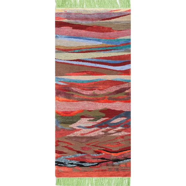 Santosh’s handcrafted rug, “Safar” (Journey), mirrors life’s twists and turns, evoking the winding roads of Achrol village. Each knot symbolizes choices that shape destiny. With vibrant hues, it illustrates how experiences—both joyful and challenging—nurture growth and wisdom.