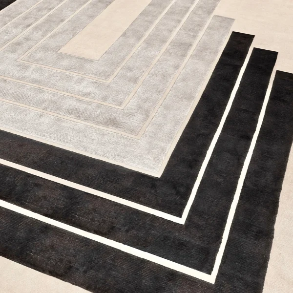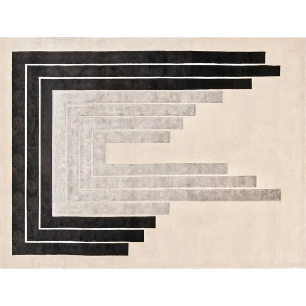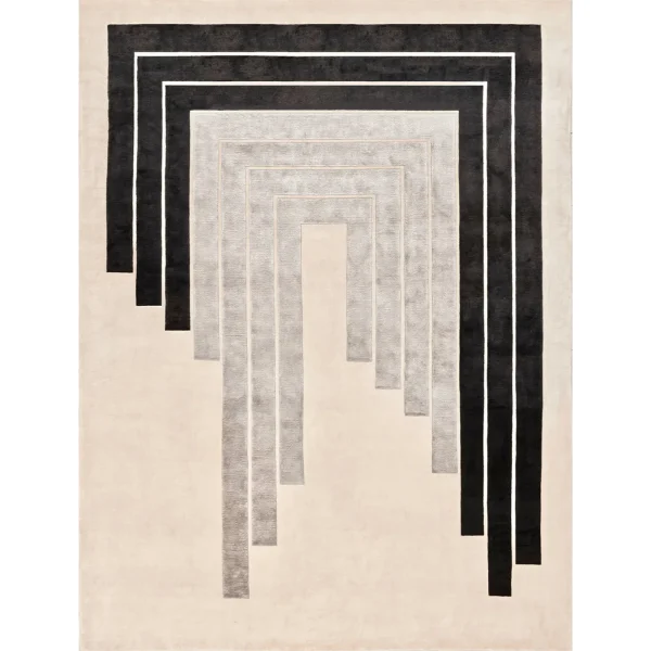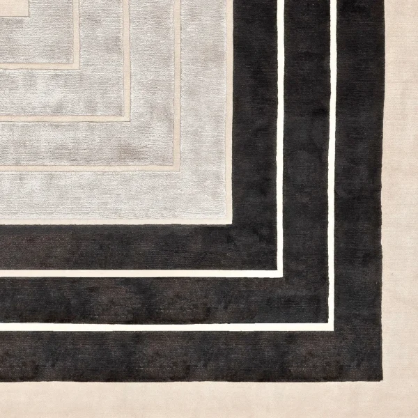 Exuding timeless elegance, this exquisite rug is a masterful creation hand-knotted in Nepal by skilled artisans, skillfully combining shimmering silk and soft Himalayan wool in equal measure. Set upon a base of gentle beige (H 0.05cm), its captivating design (H 0.07cm) features concentric frames in striking black and gray, intriguingly halting at various heights, inviting the viewer to complete their silhouette. With a density of 152,000 knots per square meter, this piece exemplifies exceptional craftsmanship. Customization options abound, allowing you to tailor the rug to your preferences. Additionally, for added convenience and longevity, a stain-resistant variant is available upon request through our Concierge service.