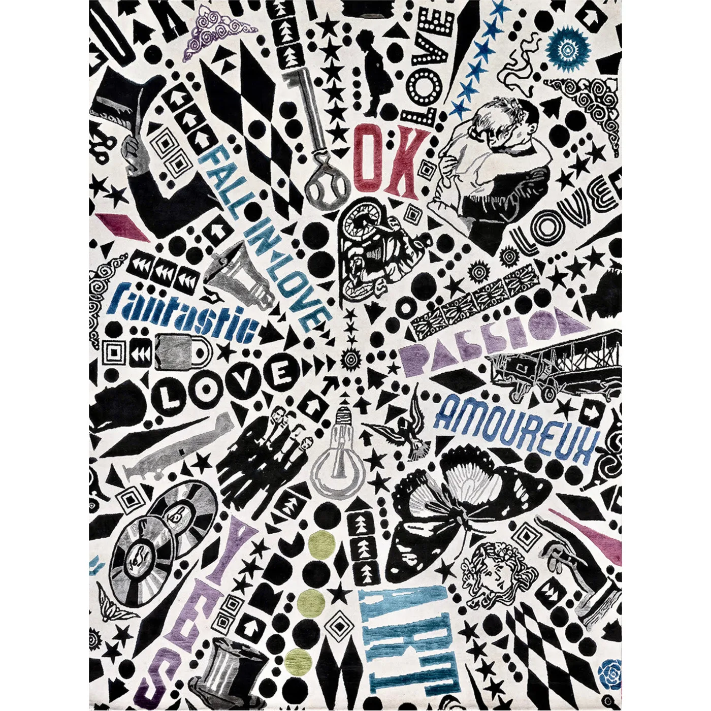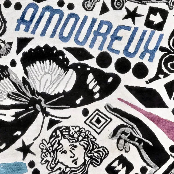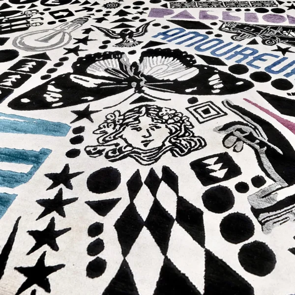 A homage to the iconic illustrations and symbols of the 20th century, this exquisite rug is a perfect match for vintage-inspired decor. Crafted by master craftsmen in Nepal, an equal blend of silk and Himalayan wool intertwine to create its mesmerizing sunburst design, standing at a height of .07cm, adorned with rich color contrasts and eloquent letterings. With a density of 152,000 knots per square meter and a .05cm-high base, this piece exudes unparalleled quality. Additionally, it can be customized with anti-stain treatment and other modifications. For further details, please consult our Concierge.