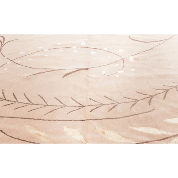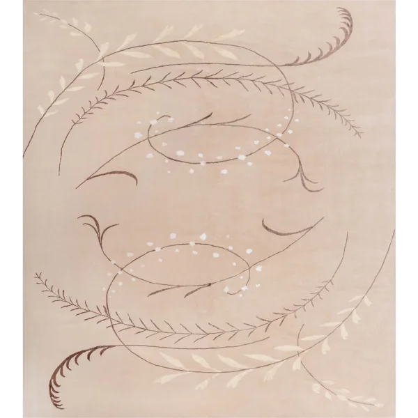A contemporary take on the Art Deco aesthetic, this hand-knotted wool and silk carpet exudes modern elegance. Delicately woven with a romantic floral motif, its light-toned field creates an airy ambiance. Curvilinear twigs adorned with stylized foliage form symmetrical arrangements along the rug’s axis, lending it a balanced and sophisticated appeal. The palette of beige, brown, cream, and off-white adds to its versatility and refinement.